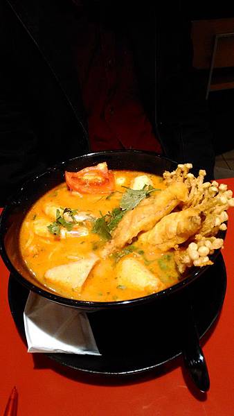 餐點上來以後,我和老公就迫不及待要吃了,老公的酸辣海鮮麵陣仗好大阿,我還第一次看到炸金針菇丟到湯麵裡頭,但味道好搭唷,不過我沒那麼愛炸物所以只吃一些~