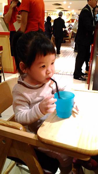 該給的小朋友餐具都有 專用喝水杯也有 剛好女兒目前最愛學大人用吸管喝水了! 看看,喝得臉鼓鼓的,好像河豚喔~