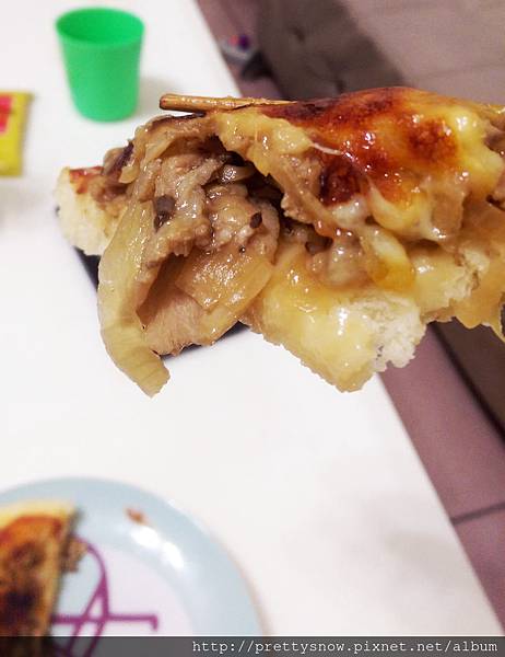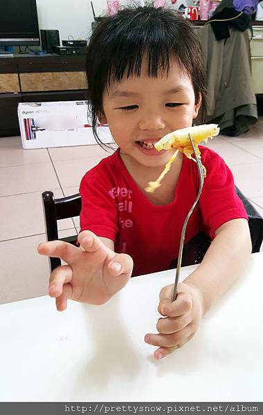 小甜蜜也好喜歡木耳披薩,吃了好幾塊,而且她覺得牽絲的起司很有趣XDD