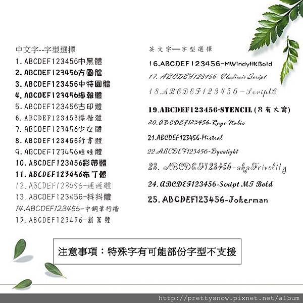 字體也可選擇,於填寫訂單資料時,於訂單備註 欄位 註明字體樣式編號及文字就可以囉!