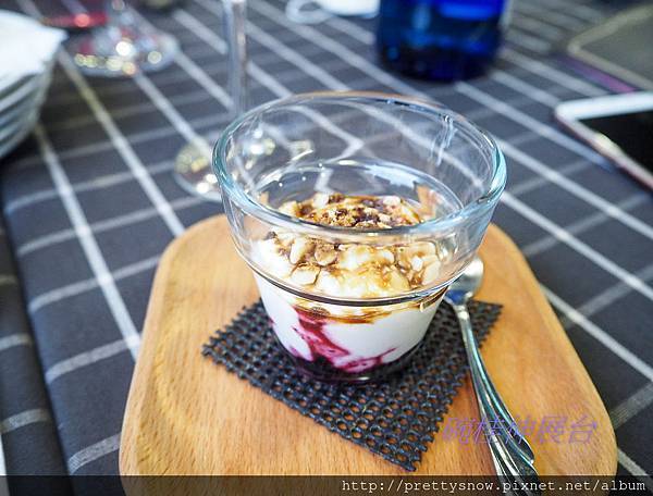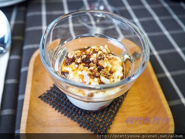 甜點一上來馬上品嚐一下,無糖優格上面是黑糖榛果配上藍莓醬,