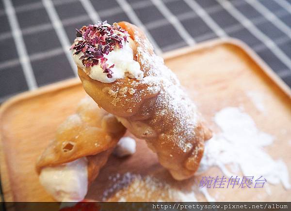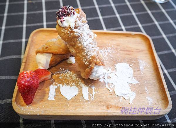 這道是西西里傳統甜點,採用cannoli紅酒餅皮並用橄欖油下去炸得酥脆,