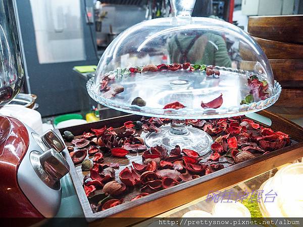 蛋糕盤也多乾燥玫瑰花瓣,浪漫氛圍一下就提升上來。